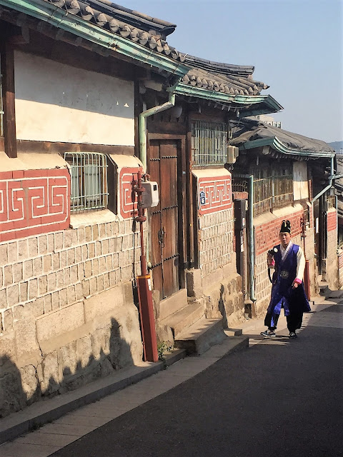 Bukchon Hanok Village is a traditional Korean village of traditional homes from the Joseon Dynasty - so about 600 years old. The word Bukchon means "northern village" and "Hanok" is the word for traditional houses. We stopped here on our all day tour of Seoul and followed our guide up - and down - the steep streets of the village. The streets were crowded with pedestrians - and some in traditional Hanbok dress for photo shoots.( There was also a man carrying a sign asking the visitors for Quiet: People live here which we saw a few times in Seoul) Some of the homes are now tea houses, gifts shops, cultural centers and guesthouses but some are still residences. It's a very popular spot and for good reason - it's one of the rare examples one can see of where someone lived so long ago and is still a thriving community.